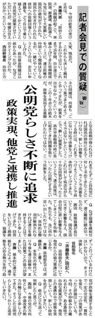 公明、連立政権に区切り/「清潔政治」の党是貫く/党首会談で斉藤代表、自民・高市総裁に伝える 公明新聞電子版 2025年10月11日付