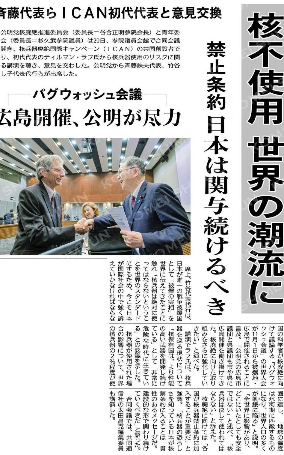 一方で、在京の時間を活かして、諸会合にも積極的に参加。核兵器廃絶推進委員会、CEPI(感染症流行対策イノベーション)理事長との勉強会、農水部会・鳥インフルエンザ対策本部合同会議などに出席。