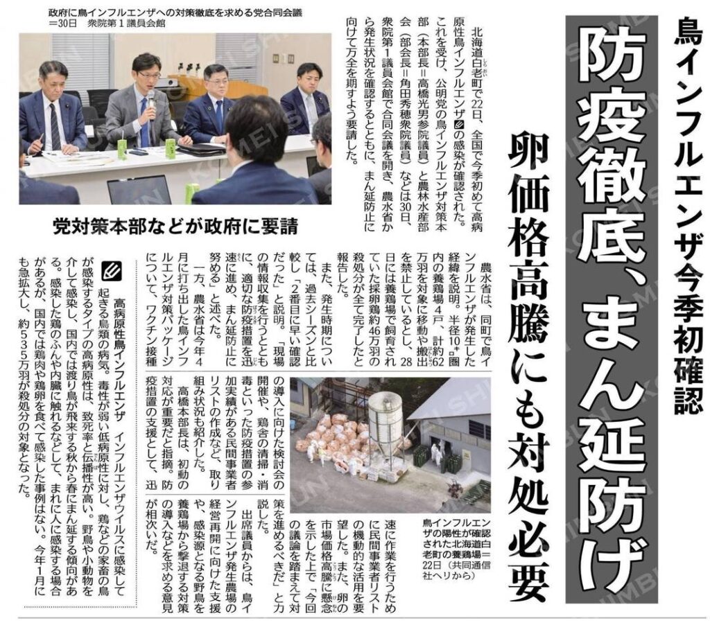 そして昨日、党鳥インフルエンザ対策本部と農林水産部会合同会議を開催し、農水省に対し防疫徹底とまん延防止の強化を要請しました。