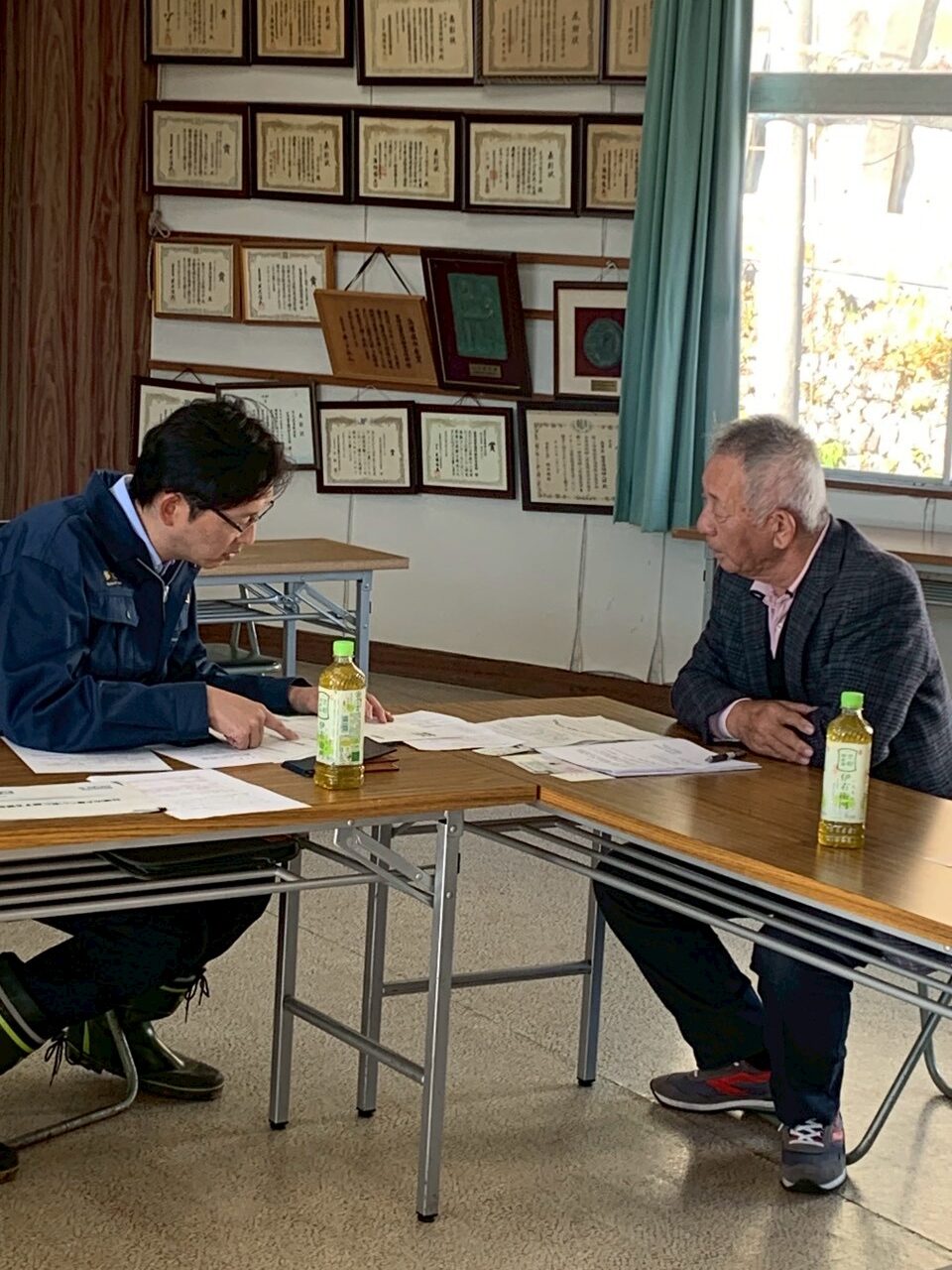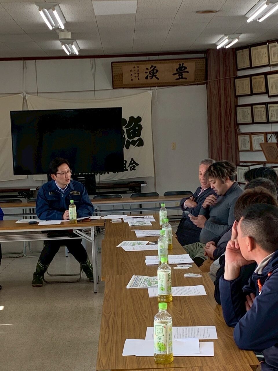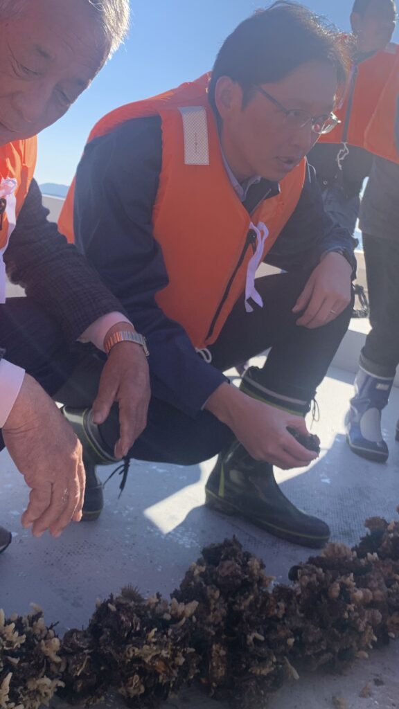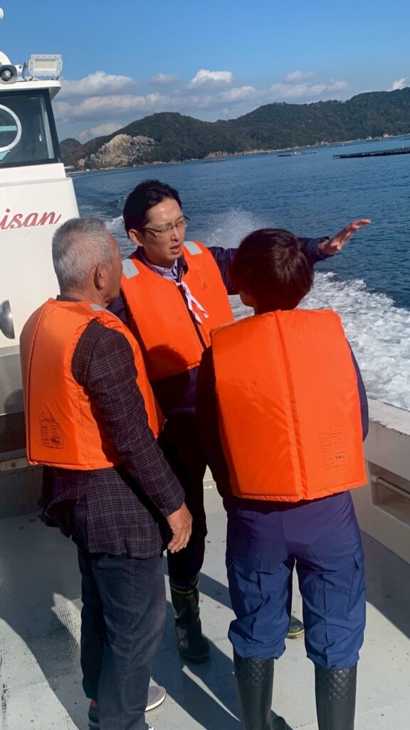中川室津漁協組合長のご案内で、沖合の養殖いかだの現状を視察し、漁業者の皆様と懇談させていただきました。