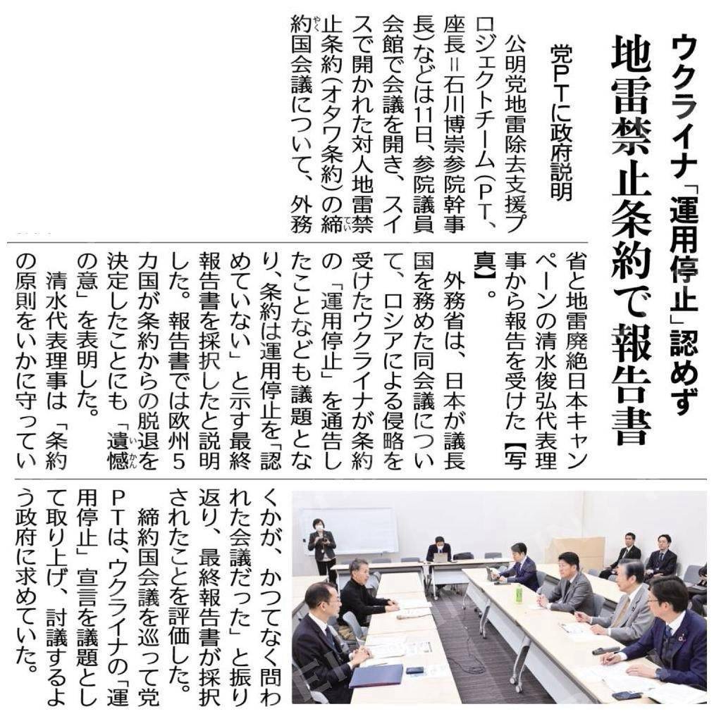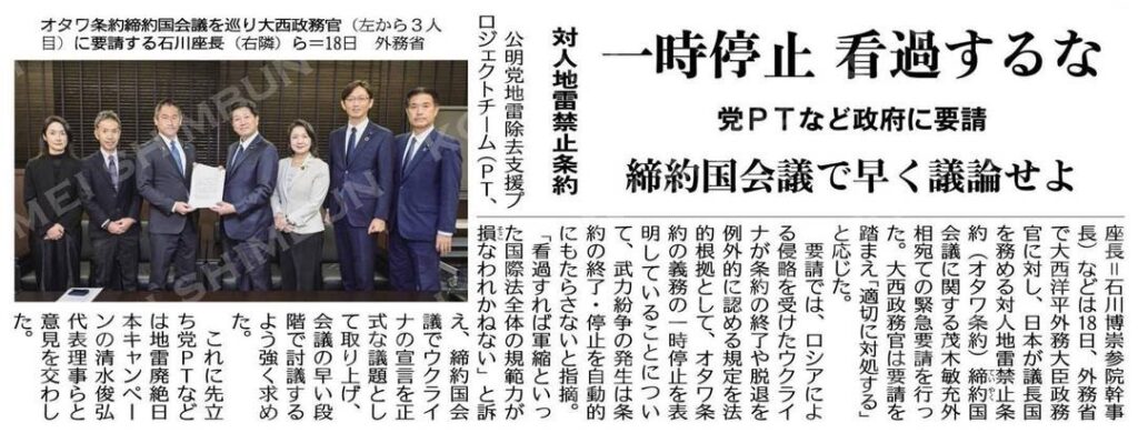 こうした問題意識から、11月に私が事務局長を務める公明党地雷対策PTで議論を行い、政府に対し、この件を会合で正式に取り上げ、早期に討議するよう緊急に要請しました。
