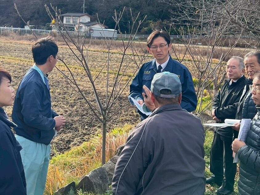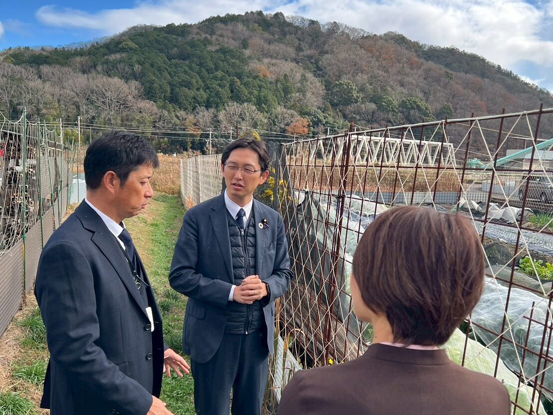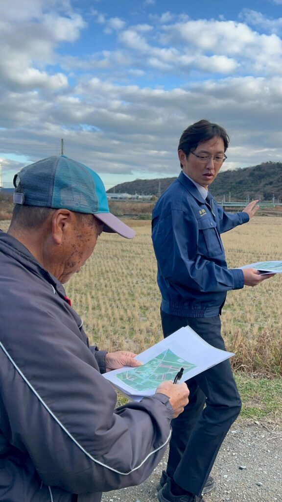 赤穂市では、岩崎農園さんの圃場を視察し、農地の集約や水利の改善について率直なお声を伺いました。